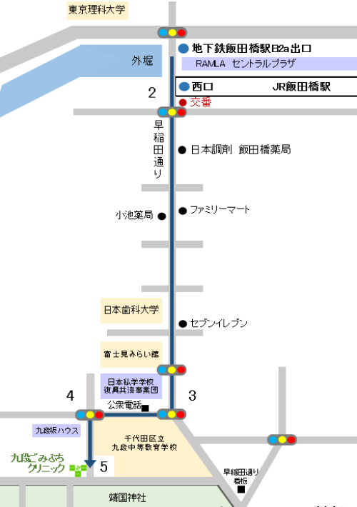 1.東京メトロ飯田橋駅B2a出口またはJR飯田橋駅西口から出て左折してください。 2.そのまま600mほど直進します。途中2つの信号を通過します。 3.駅から数えて3つ目の信号で右折します。 4.曲がってすぐの十字路を左折します。 5.少し直進した先に当院がございます。